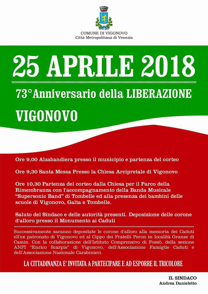 Mercoledì 25 aprile 2018 si è tenuta la consueta Cerimonia in ricordo della liberazione dell’Italia dal nazifascismo, avvenuta il 25 aprile 1945. E’ stata celebrata la Santa Messa nella Chiesa di Vigonovo e sono state altresì deposte due corone di alloro alla memoria dei Caduti.
