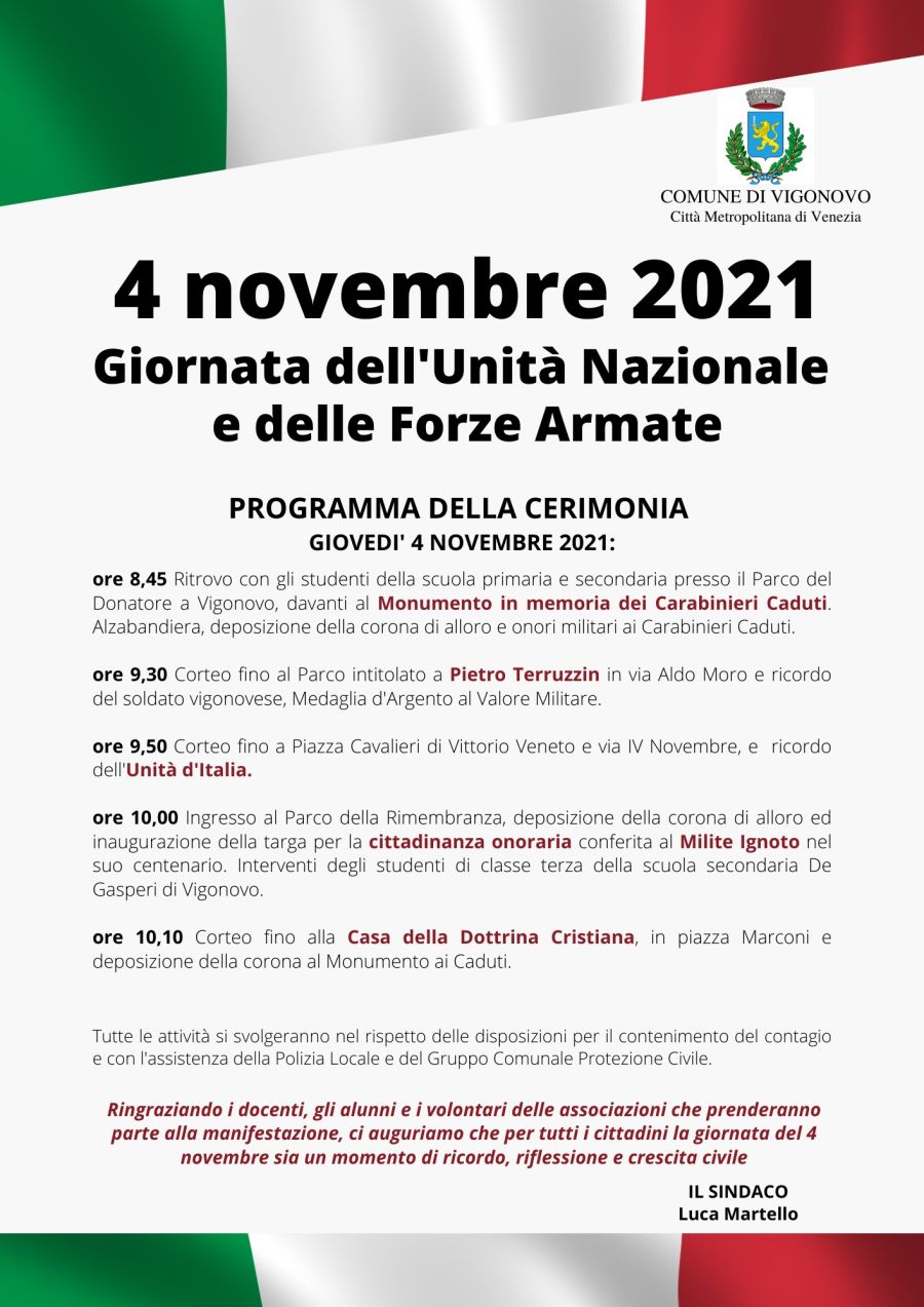 Cerimonia dell'Unità Nazionale e delle Forze Armate 2021 a Vigonovo Giovedì 4 novembre 2021 a Vigonovo si è tenuta la Cerimonia dell’Unità Nazionale e delle Forze Armate 2021. Precedente Successivo