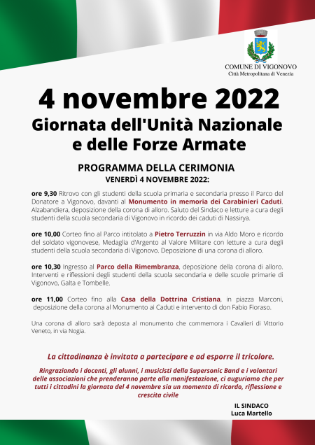 Cerimonia dell'Unità Nazionale e delle Forze Armate 2022 a Vigonovo Venerdì 4 novembre 2022 a Vigonovo si è tenuta la Cerimonia dell’Unità Nazionale e delle Forze Armate 2022. Precedente Successivo