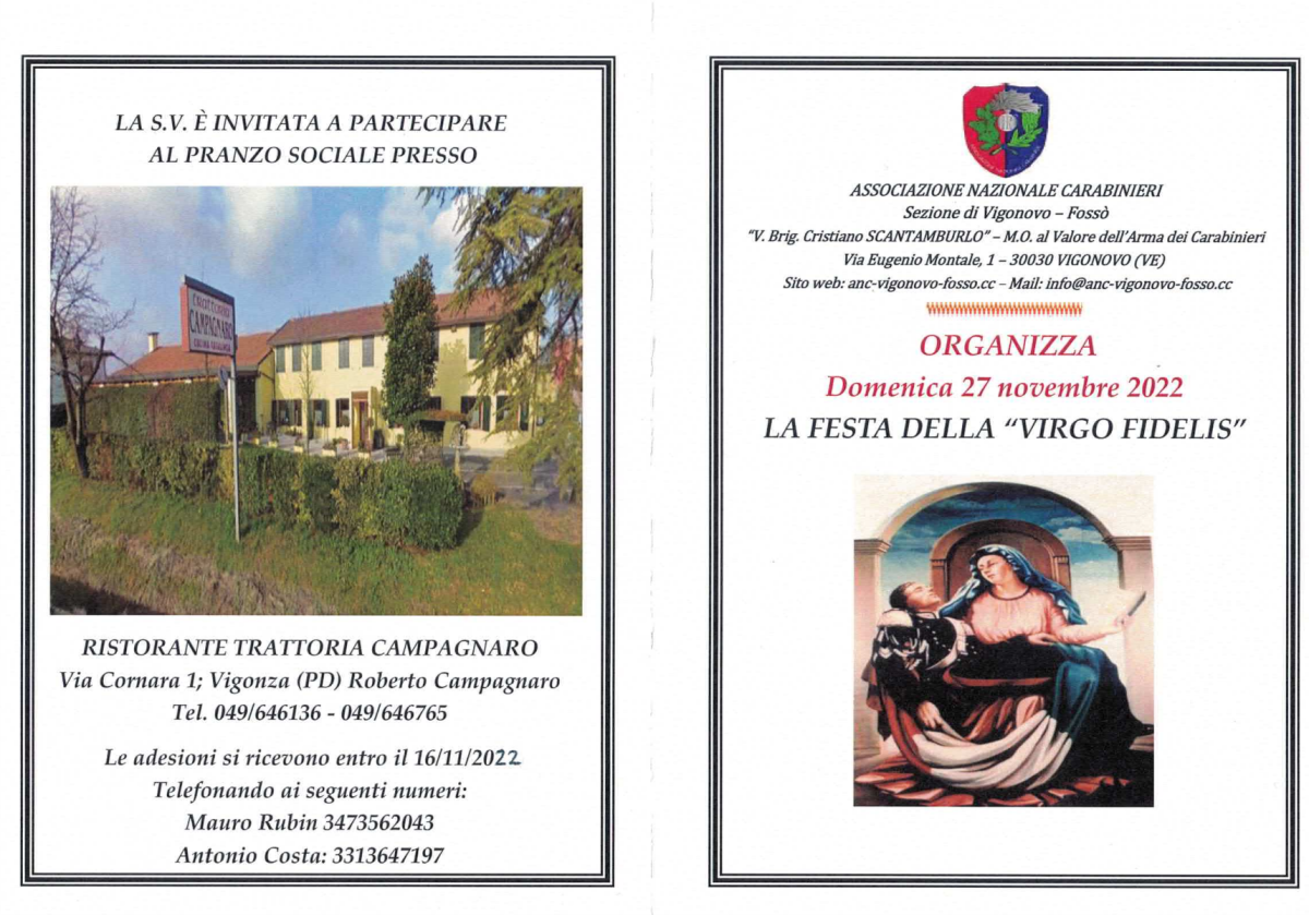 Festa Virgo Fidelis 2022 Domenica 27 novembre 2022 presso il Ristorante Campagnaro di Vigonza (PD) si è tenuta la Festa della Virgo Fidelis 2022. Precedente Successivo