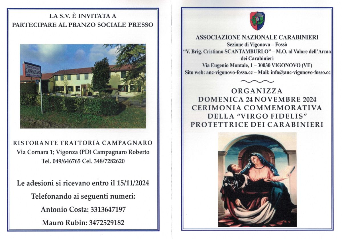Festa della Virgo Fidelis 2024 Domenica 24 novembre 2024 a Vigonovo (VE) si è svolta la Festa della Virgo Fidelis 2024. Precedente Successivo
