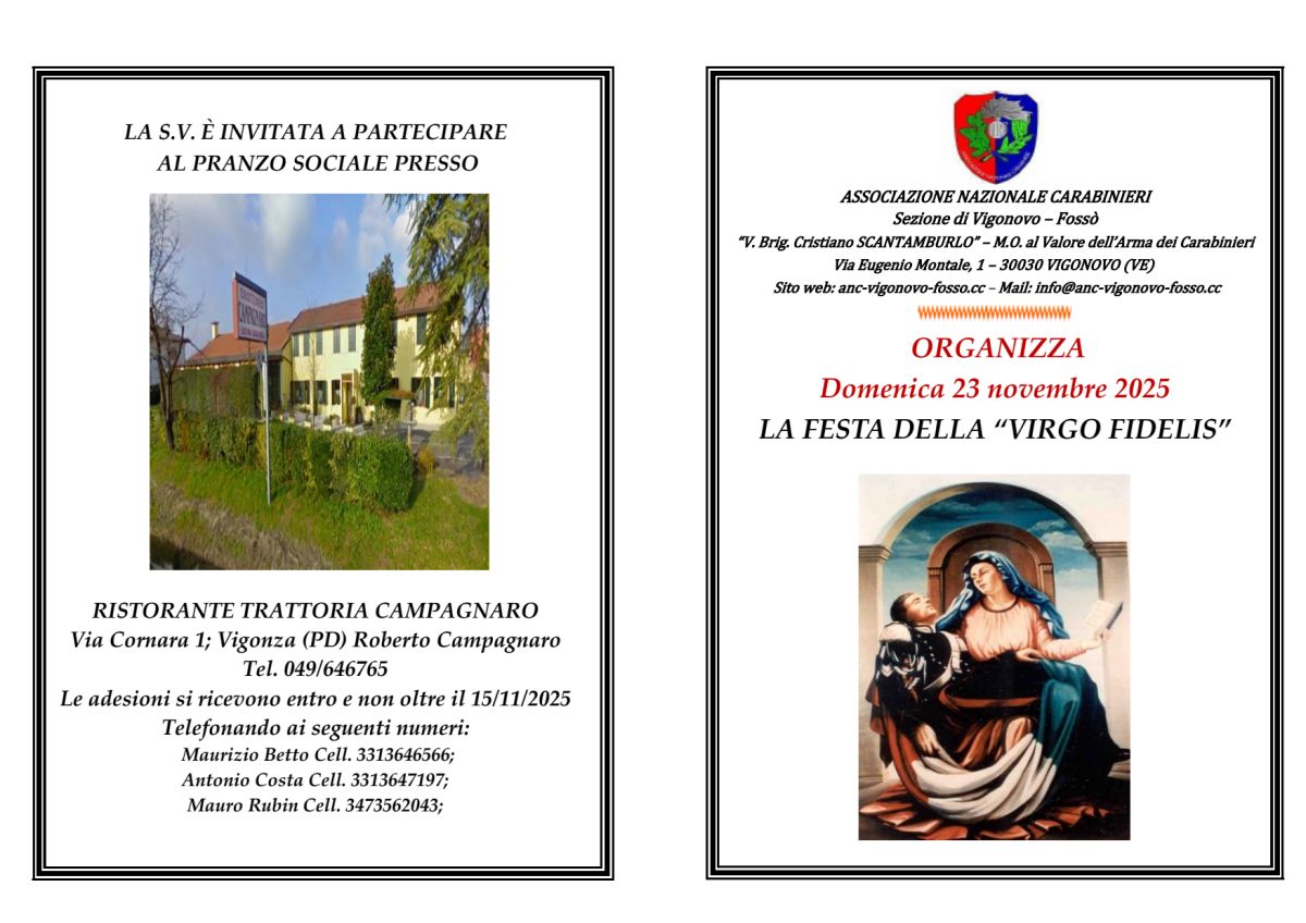 Festa della Virgo Fidelis 2025 Domenica 23 novembre 2025 a Fossò (VE) si è tenuta la Festa della Virgo Fidelis 2025. Precedente